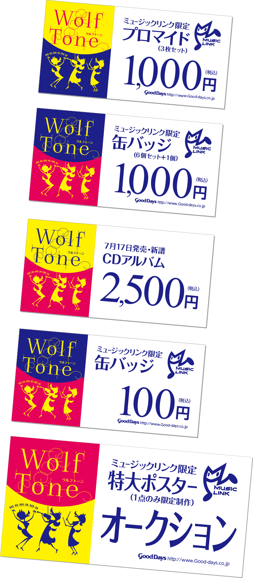 BACK WOLFTONE 一般社団法人関西ミュージックリンク協会 主催コンサート「ウルフトーン」 Facebook宣伝PV クリックすると動画が再生されます。 会場オリジナル販売グッズ ポスター(450mm×950mm) ブロマイド(178mm×127mm) 缶バッジ(30mm×30mm) ステッカー(96mm×162mm・全12種) 会場案内ツール 案内用パネル(140mm×366mm) プライスカード(90mm×45mm) 戻る