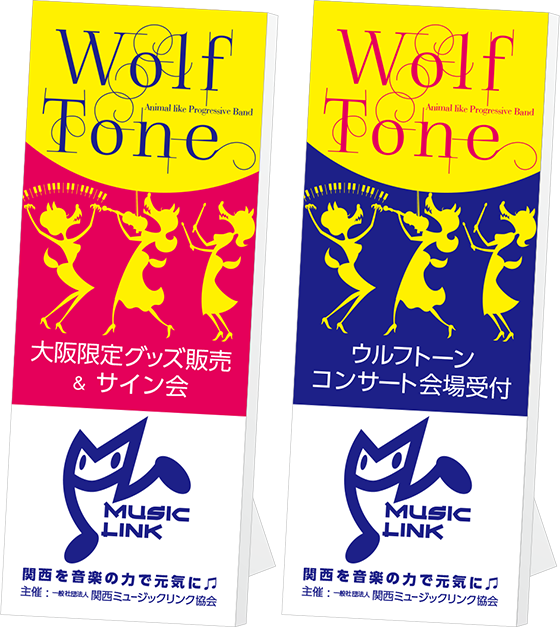 BACK WOLFTONE 一般社団法人関西ミュージックリンク協会 主催コンサート「ウルフトーン」 Facebook宣伝PV クリックすると動画が再生されます。 会場オリジナル販売グッズ ポスター(450mm×950mm) ブロマイド(178mm×127mm) 缶バッジ(30mm×30mm) ステッカー(96mm×162mm・全12種) 会場案内ツール 案内用パネル(140mm×366mm) プライスカード(90mm×45mm) 戻る